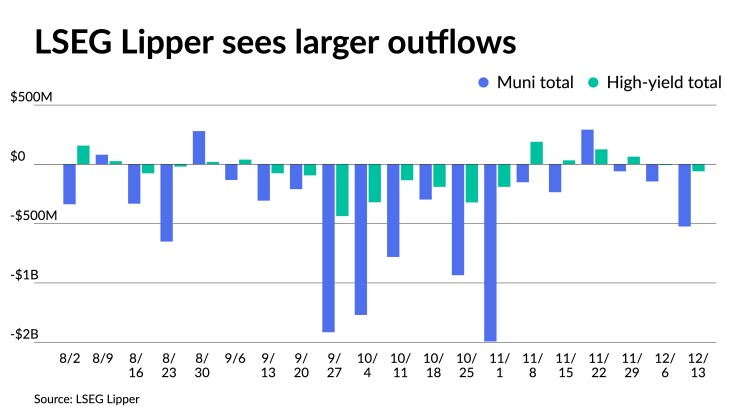 LSEG Lipper reported Thursday that investors pulled $524.3 million from muni mutual funds for the week ending Wednesday after outflows of $144.4 million the week prior.