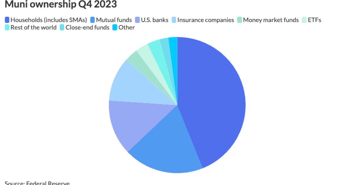 Household ownership of individual bonds remained the largest category of muni ownership at 43.9%, mutual funds at 19%, ETFs at 3% and U.S. banks at 13.2%. Life insurance companies own 5% and property and casualty insurers at 5.6%.