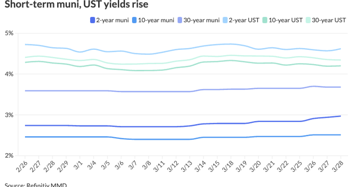 Refinitiv MMD’s scale saw cuts on the short-end: The one-year was at 3.24% (+5) and 2.97% (+3) in two years. The five-year was at 2.54% (unch), the 10-year at 2.51% (unch) and the 30-year at 3.68% (unch) at 1 p.m.