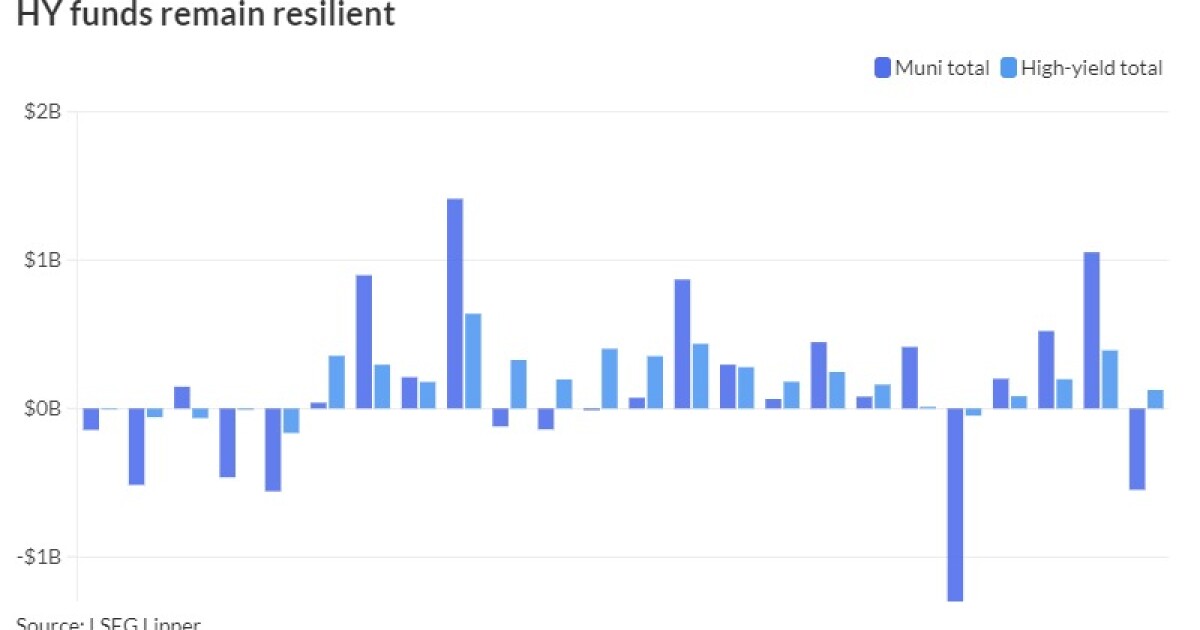 Municipal bond mutual funds saw outflows of $548 million, per LSEG Lipper data, while high-yield saw inflows of $125 million, as