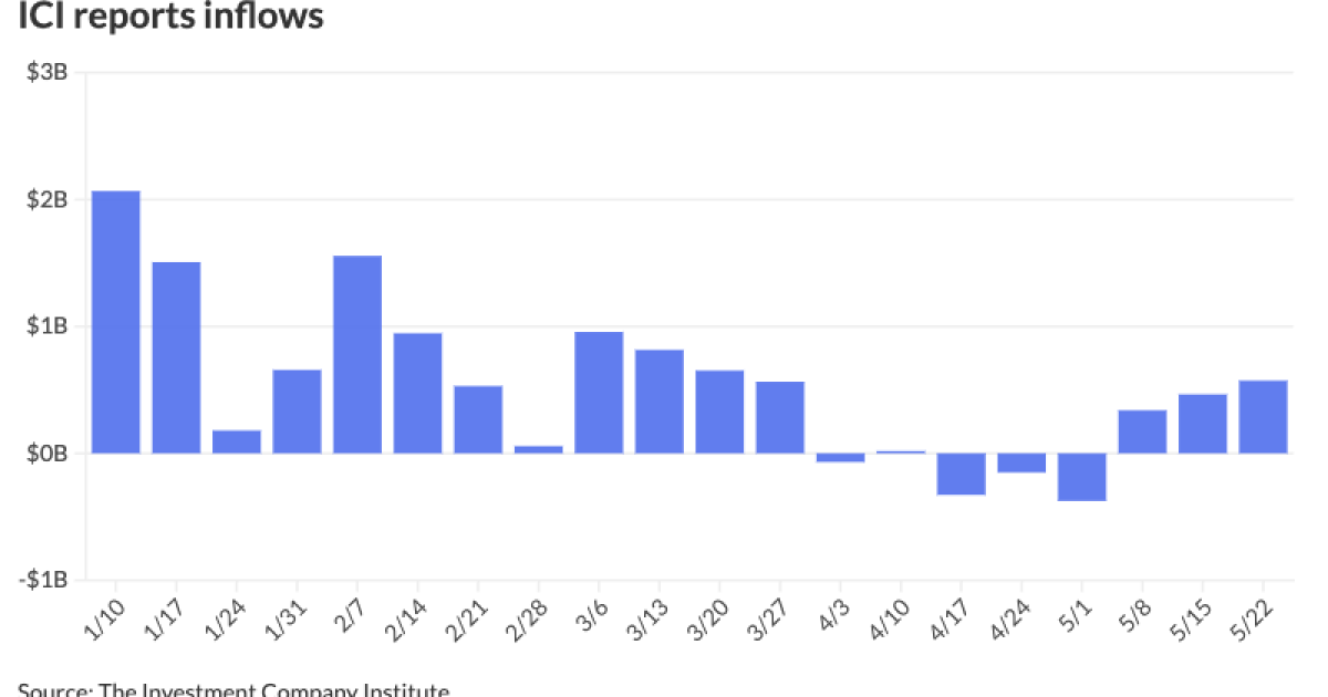 The Investment Company Institute reported inflows into municipal bond mutual funds for the week ending May 22, with investors adding $573 million to funds following $465 million of inflows the week prior. This differs from the