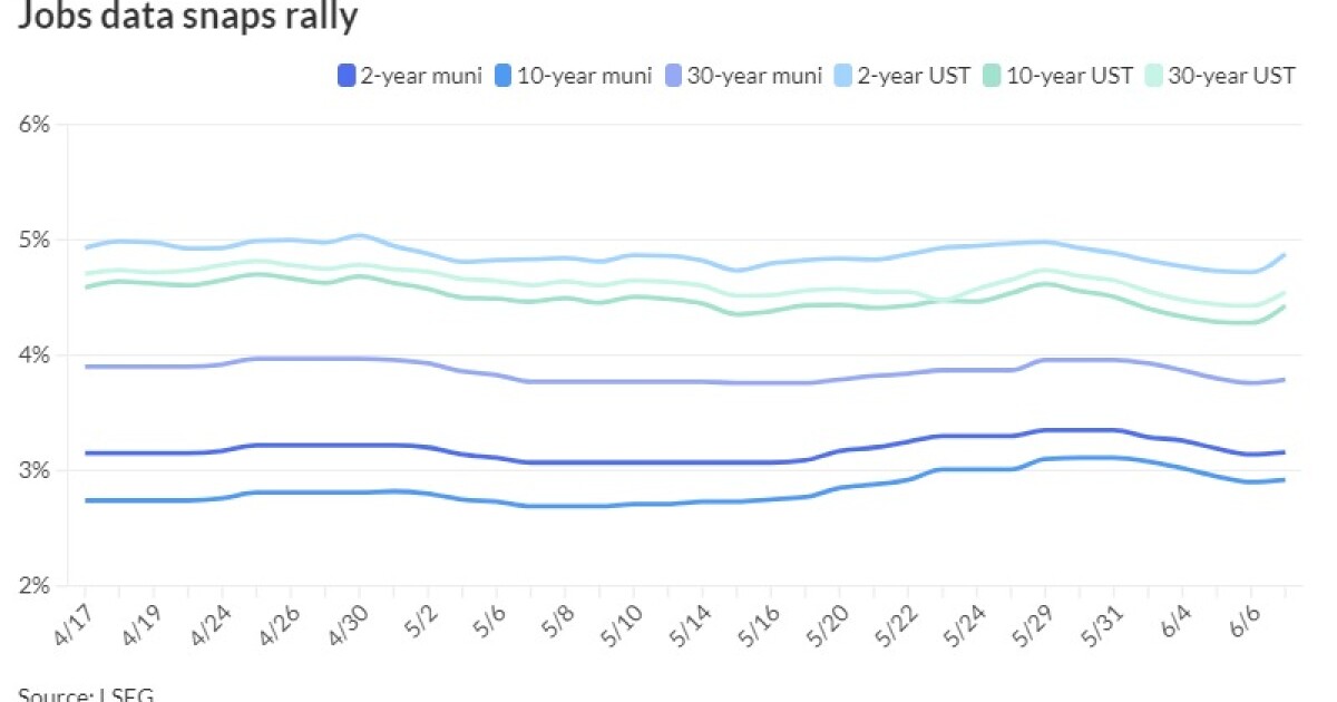 Ratios, which had risen in May, fell with Friday’s new Treasury levels, pushing muni to UST ratios lower again, depending on the triple-A scale.