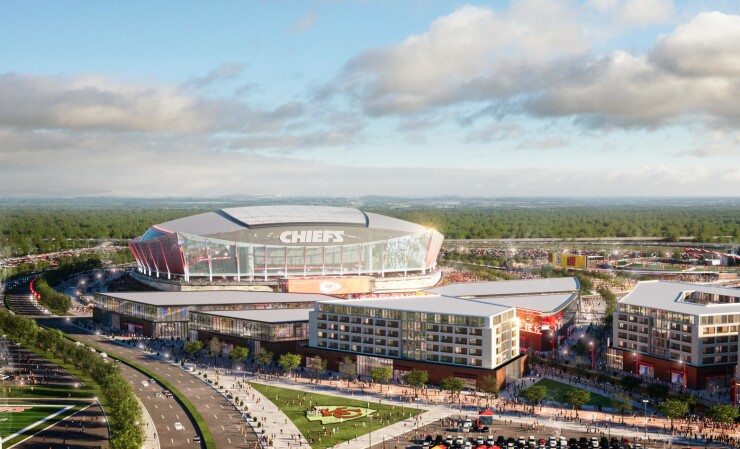 Besides expanding STAR bond-financed project costs to 70% from the current 50%, the law extends the maturity of the debt to as much as 30 years, up from 20 years. It also contemplates the possibility of a stadium project being located in an existing STAR bond district by mandating priority repayment for outstanding bonds.