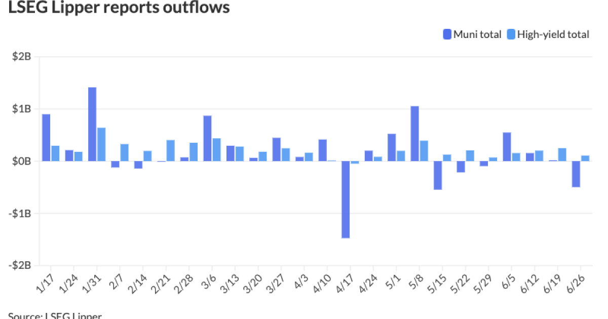 Municipal bond mutual funds saw outflows as investors pulled $498 million from funds after $16 million of inflows the week prior, according to LSEG Lipper. Outflows this week were led by long-term funds.
